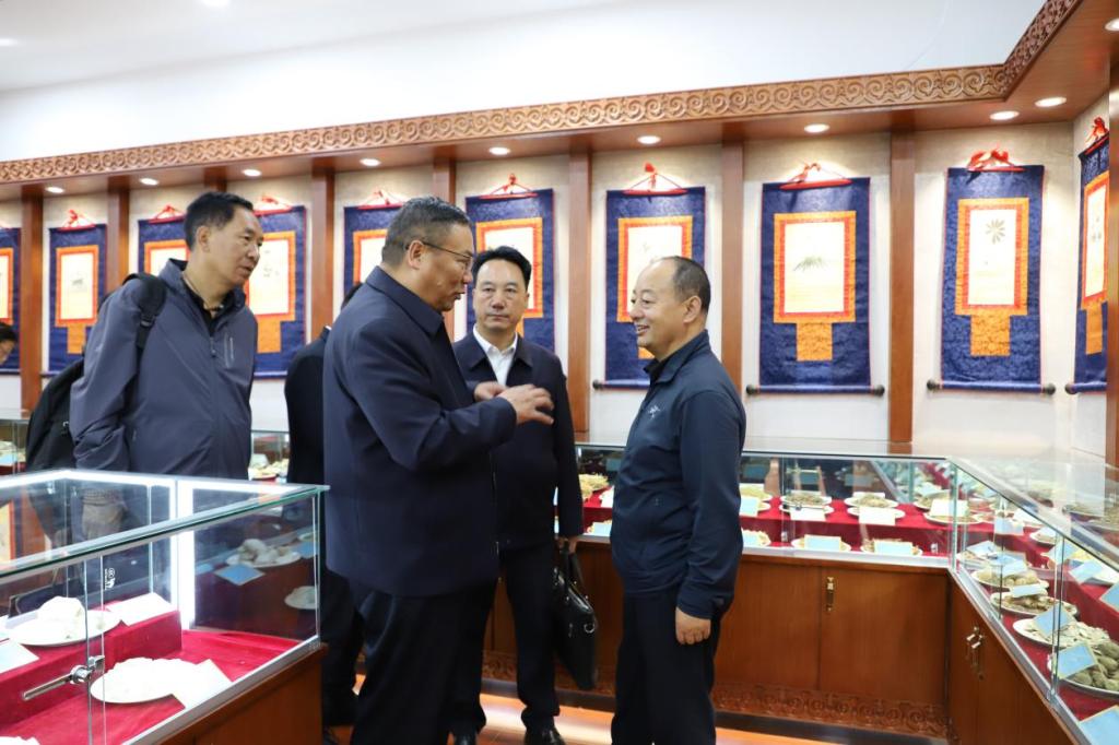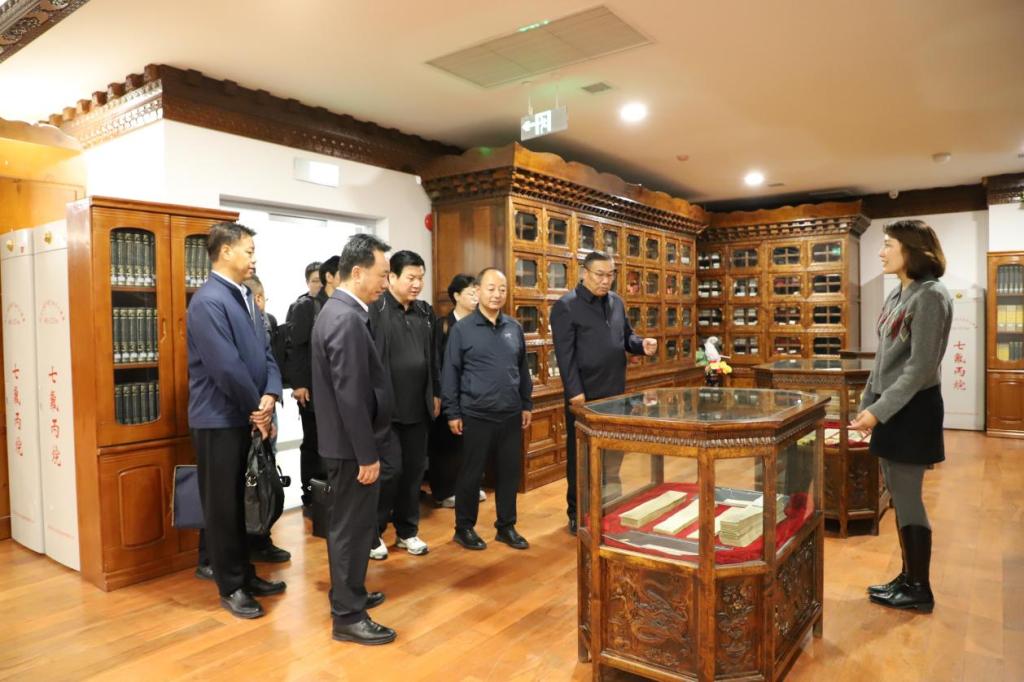 在实验标本中心,代表团参观了藏药植物标本室、藏药矿物标本室、水银洗炼流程标本室、外治器械文物展室及藏药图谱认药实训室,各标本室系统收藏高原特色藏药材标本,水银洗炼流程标本完整呈现传统藏药炮制关键技艺环节,外治器械文物展室陈列历代藏医使用的针灸、放血、拔罐等外治器械,藏药图谱认药实训室以“图谱+实物”结合模式助力实操教学,代表团成员与中心工作人员深入交流标本采集、保存及教学应用情况,对学校依托实物资源开展实践教学的模式给予肯定。